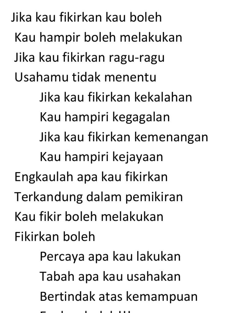 Kau hampir boleh melakukan Jika kau fikirkan ragu-ragu Usahamu tidak menentu Jika kau fikirkan kekalahan Kau hampiri kegagalan Jika kau fikirkan kemenangan Kau hampiri kejayaan. Kau fikir boleh melakukan. MdAzlimdazli NAZ HUSSAINnazhussain_146 Siti.